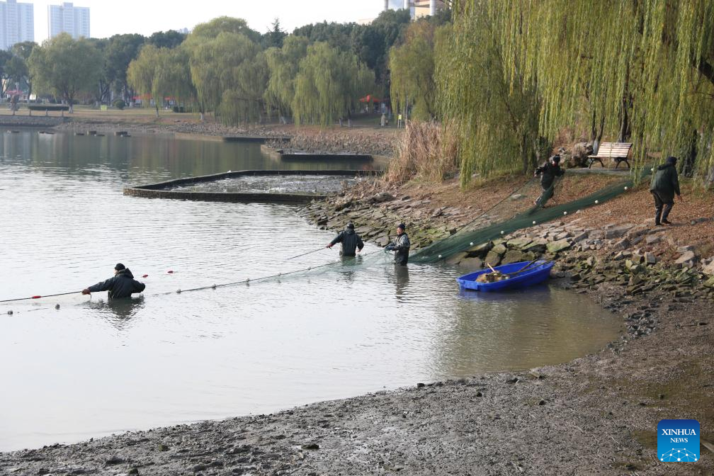 Staff members catch fish with a net at the Hunan University of Arts and Science in Changde, central China's Hunan Province, Dec. 25, 2023.?(Photo by Cai Wenlong/Xinhua)