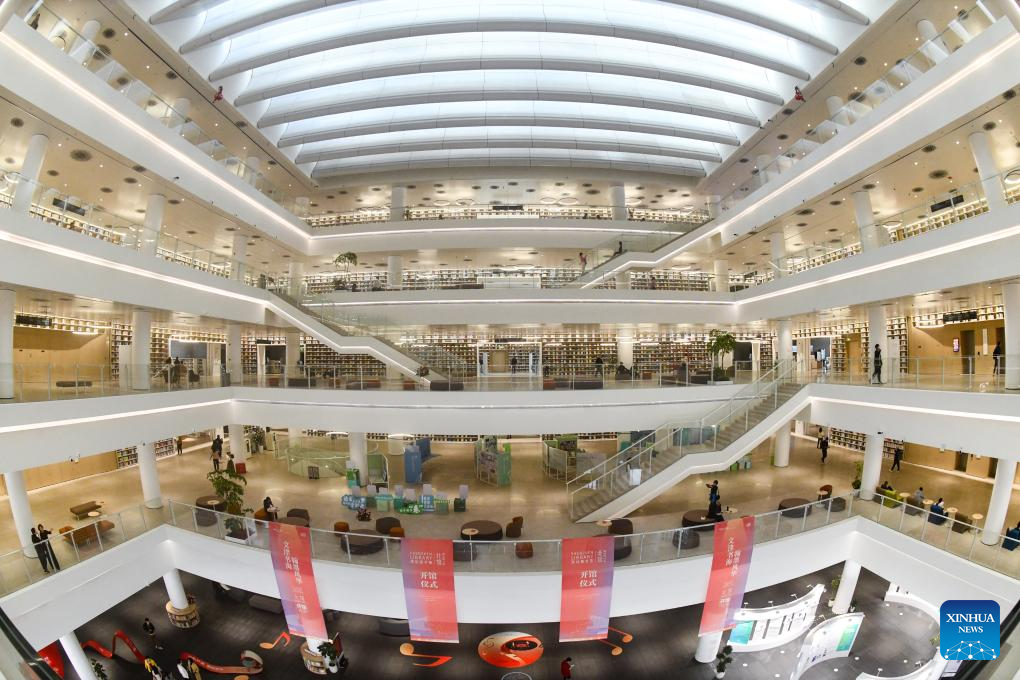 People visit the north hall of Shenzhen Library in Shenzhen, south China's Guangdong Province, Dec. 28, 2023. Located in Longhua District of the city, the north hall of Shenzhen Library officially opened on Thursday. With a building area of about 72,000 square meters, the hall is designed to stock 8 million books and provides 2,500 seats. (Xinhua/Liang Xu)