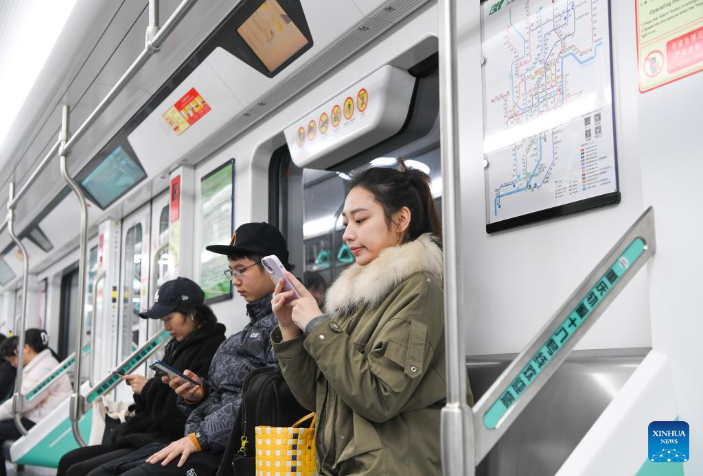 Passengers take Chongqing Rail Transit Line 18 in southwest China's Chongqing Municipality, Dec. 28, 2023. Chongqing Rail Transit (CRT) Line 18, which is 29 kilometers long and has 19 stations, officially started initial operation on Thursday. So far, a total of 13 rail transit lines are in operation in the city with an operating length reaching 538 kilometers. (Xinhua/Wang Quanchao)