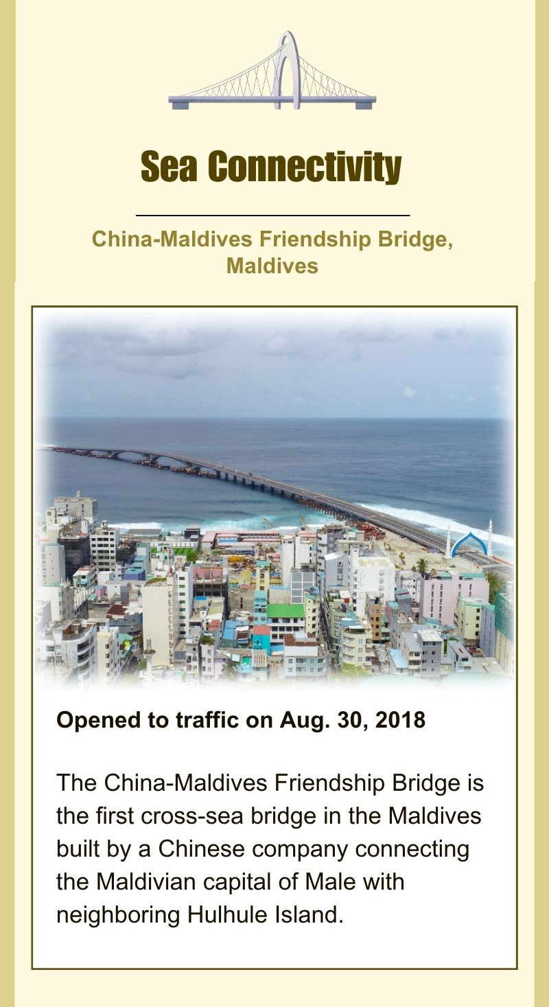 The 2-km-long bridge is an iconic project of the Maldives and China in co-building the 21st Century Maritime Silk Road. The bridge makes it possible for locals and tourists to travel between the two islands within five minutes.