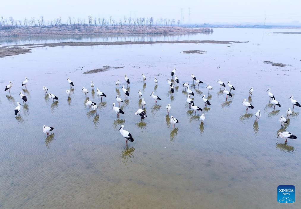 This aerial photo taken on Dec. 28, 2023 shows a flock of oriental storks (Ciconia boyciana) in a wetland in Changlinhe Township of Feidong County, Hefei City, east China's Anhui Province. (Photo by Chen Zhen/Xinhua)
