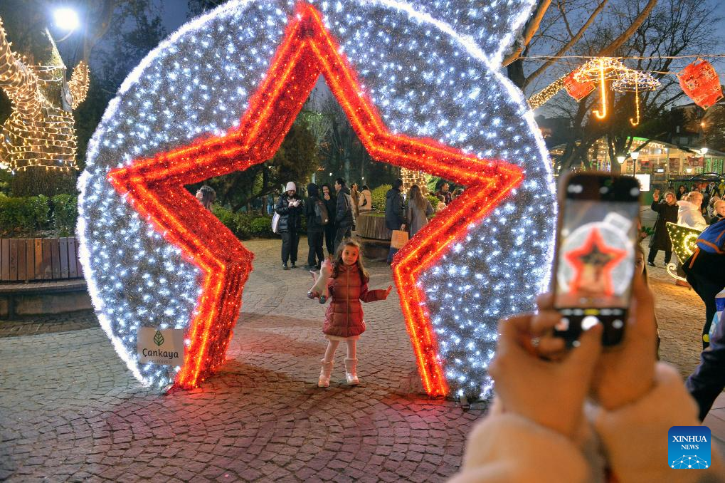A girl poses for photos with New Year's lights installations in Ankara, Türkiye, Dec. 30, 2023. (Mustafa Kaya/Handout via Xinhua)
