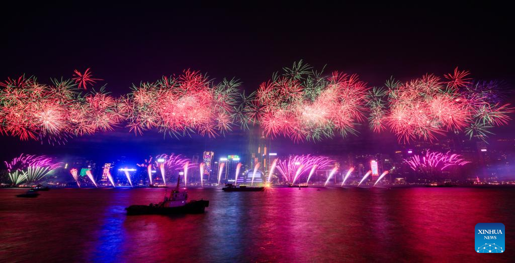 Fireworks in celebration of the New Year illuminate the sky over Victoria Harbour in Hong Kong, south China, Jan. 1, 2024. (Xinhua/Chen Duo)