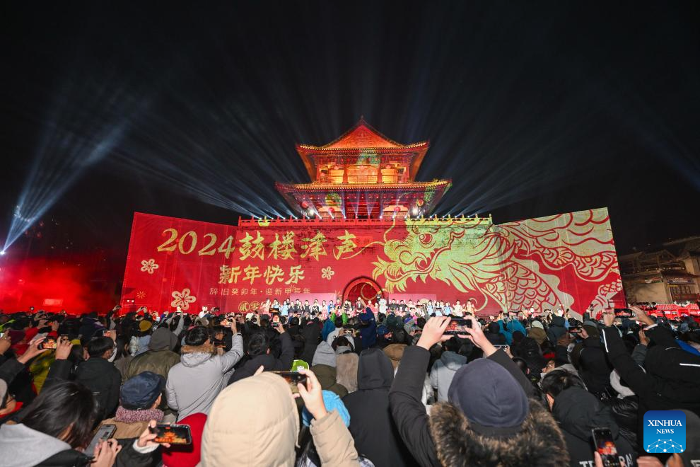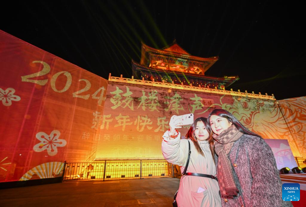 People greet the New Year at the Drum Tower in Tianjin, north China, Jan. 1, 2024. Various events are held across the country to celebrate the New Year. (Xinhua/Sun Fanyue)