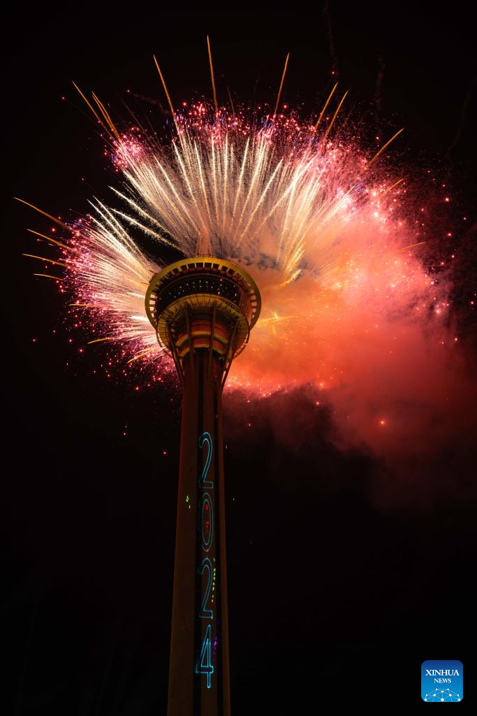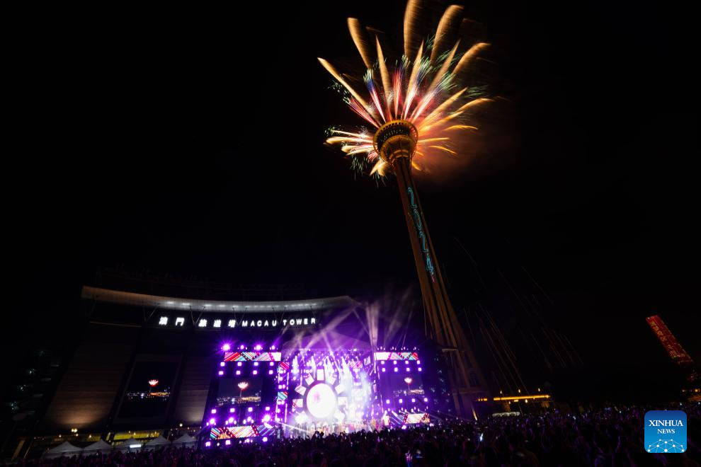 This photo taken on Jan. 1, 2024 shows fireworks above the Macao Tower in Macao, south China. Various events are held across the country to celebrate the New Year. (Xinhua/Cheong Kam Ka)
