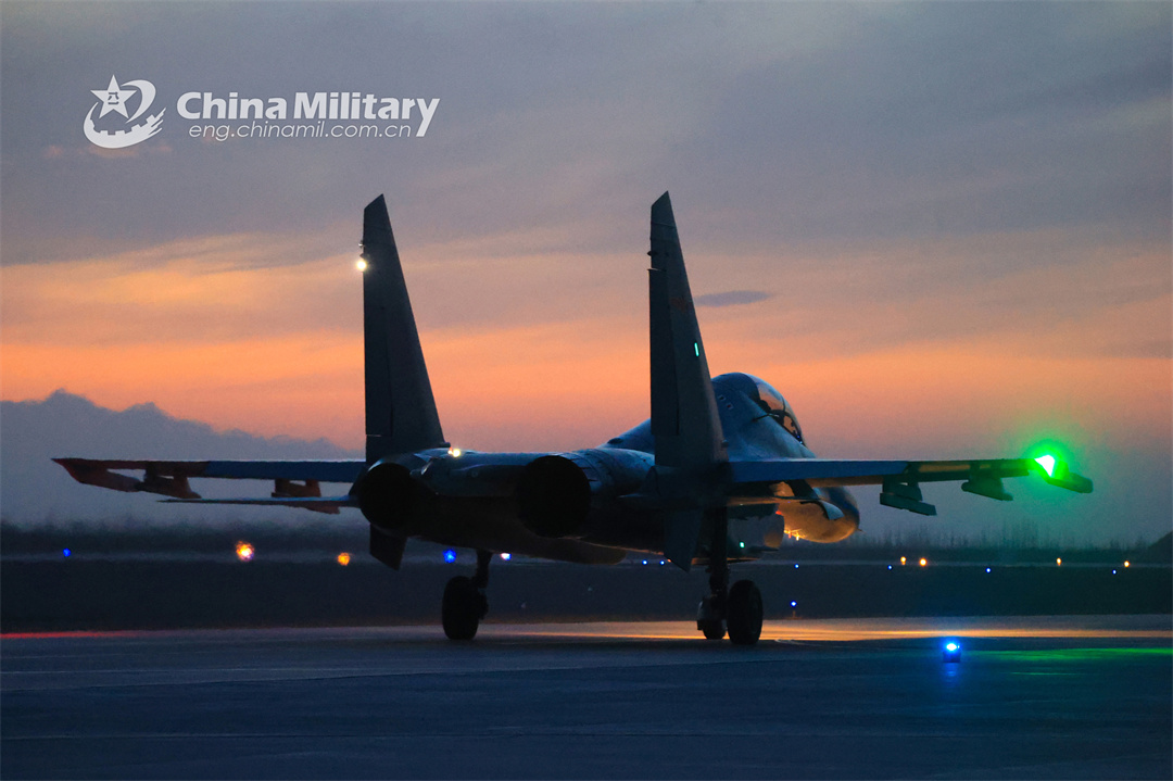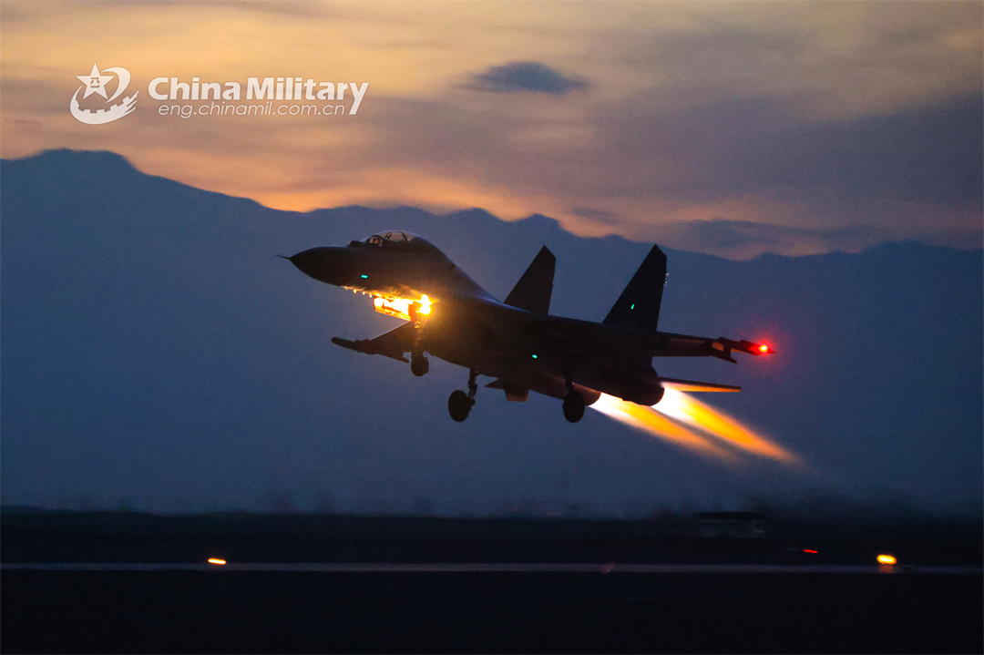 A fighter jet attached to a brigade of the PLA Air Force Xi'an Flying College soars into the sky at dusk during a 24-hour flight training exercise on December 23, 2023. (eng.chinamil.com.cn/Photo by Cui Baoliang)