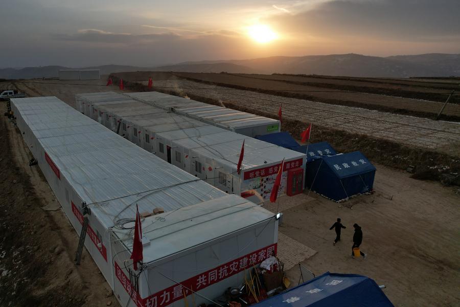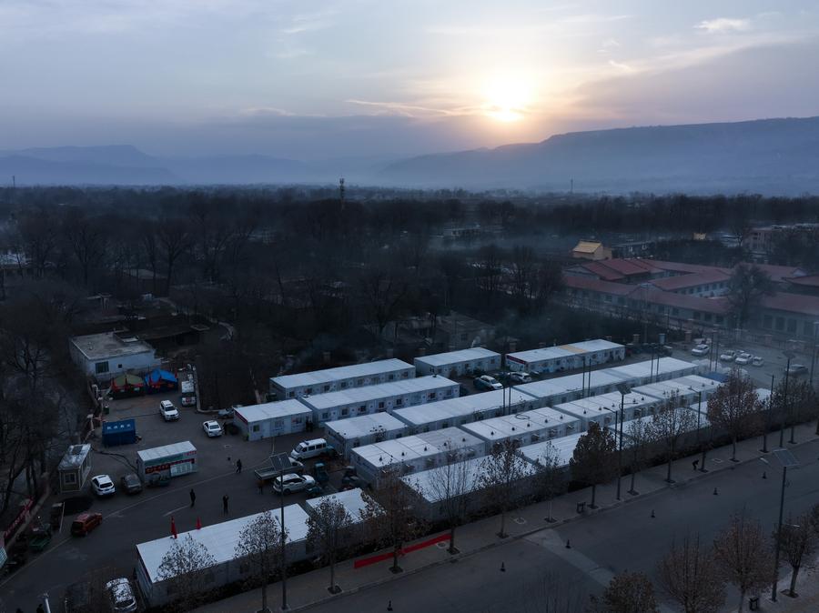 This aerial photo taken on Jan. 1, 2024 shows a temporary relocation site at sunrise in Shenjiaping Village of Shiyuan Township, Jishishan County, northwest China's Gansu Province. (Xinhua/Fan Peishen)