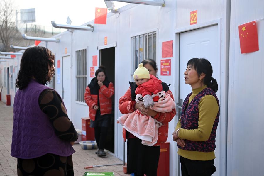 Villagers talk to each other at a temporary relocation site in Tuanjie Village of Liuji Township, Jishishan County, northwest China's Gansu Province, Jan. 1, 2024. (Xinhua/Fan Peishen)