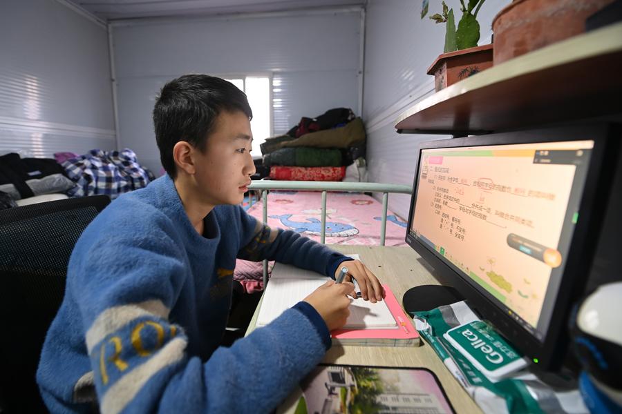A student takes online classes in a prefabricated house at a temporary relocation site in Shenjiaping Village of Shiyuan Township, Jishishan County, northwest China's Gansu Province, Jan. 1, 2024. (Xinhua/Fan Peishen)