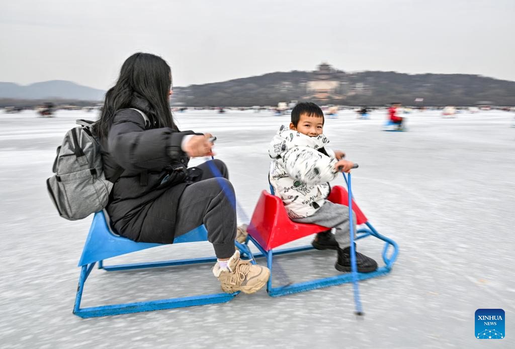 Tourists ride sleds on a frozen lake at the Summer Palace in Beijing, capital of China, Jan. 1, 2024. (Xinhua/Chen Yehua)