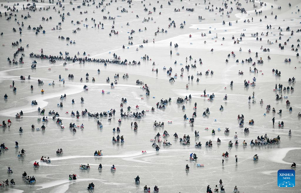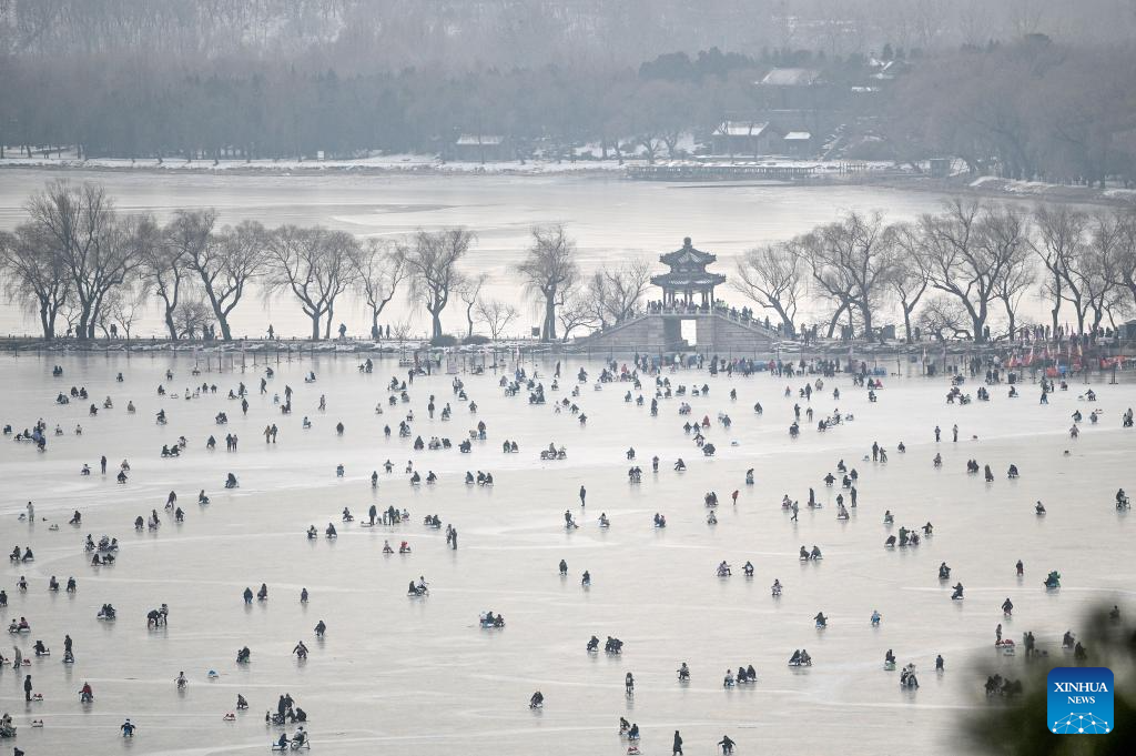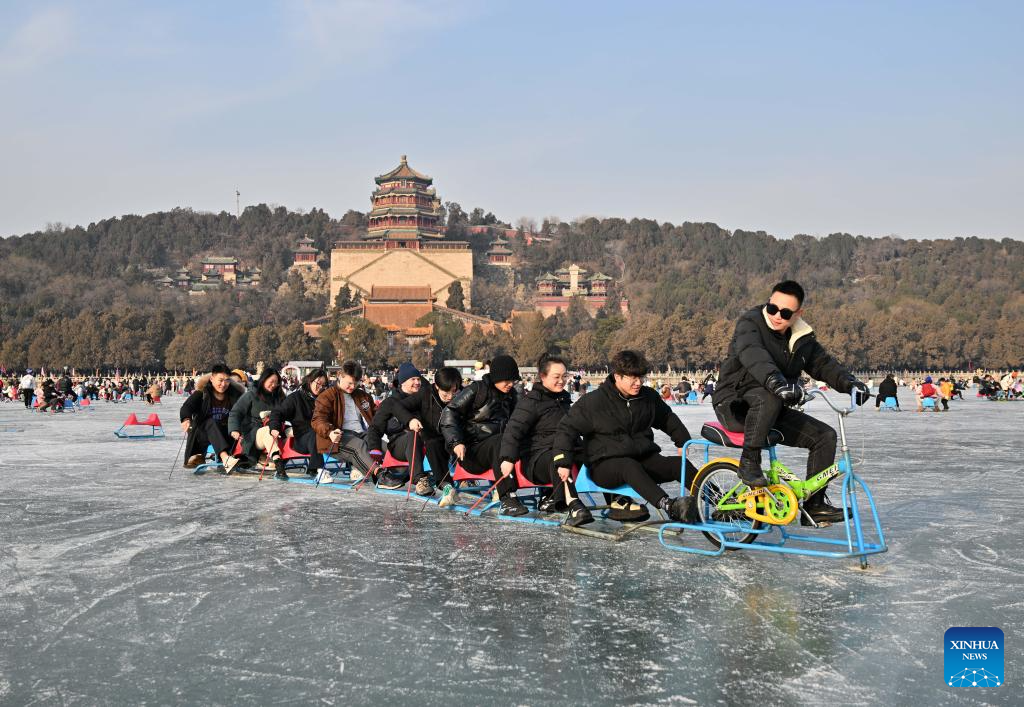 Tourists have fun on a frozen lake at the Summer Palace in Beijing, capital of China, Jan. 1, 2024. (Xinhua/Chen Yehua)