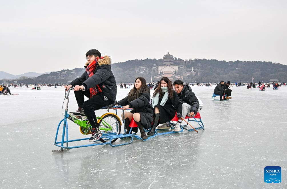 Tourists ride a bicycle combined with sleds on a frozen lake at the Summer Palace in Beijing, capital of China, Jan. 1, 2024. (Xinhua/Chen Yehua)