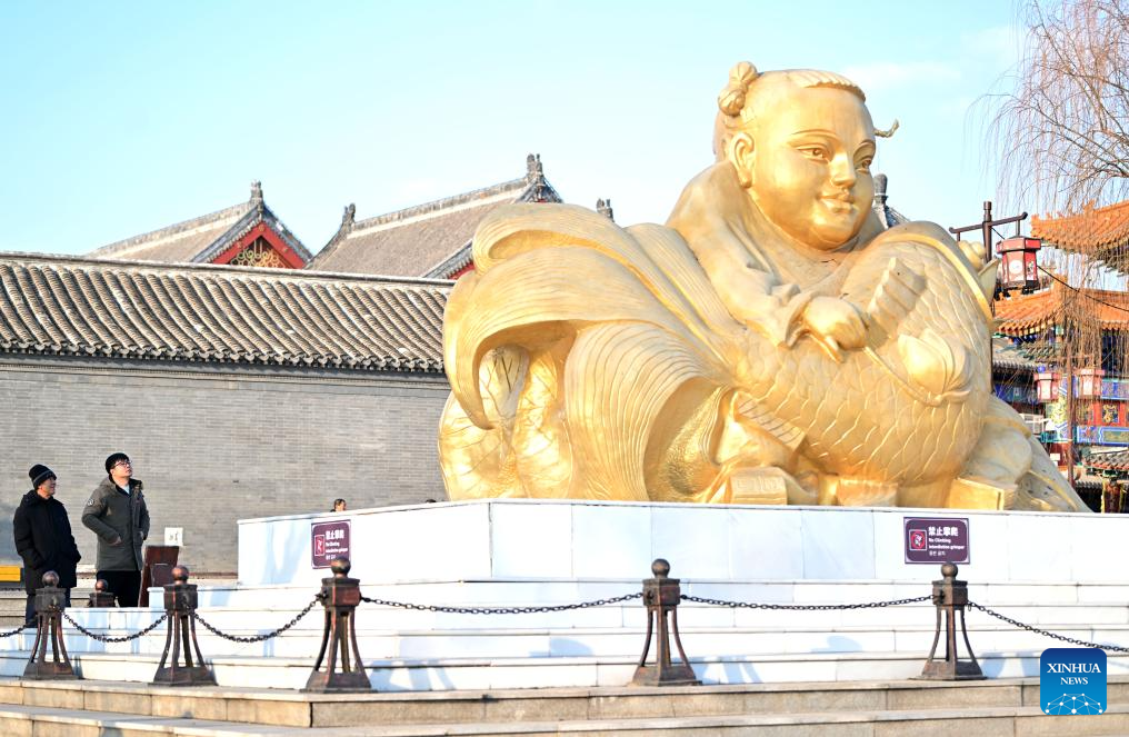 Xi Wang (2nd, L) and his mentor Wang Wenda (1st, L) watch a sculpture inspired by a typical figure in traditional new year pictures at Yangliuqing Town in Tianjin, north China, Dec. 27, 2023. (Xinhua/Li Ran)