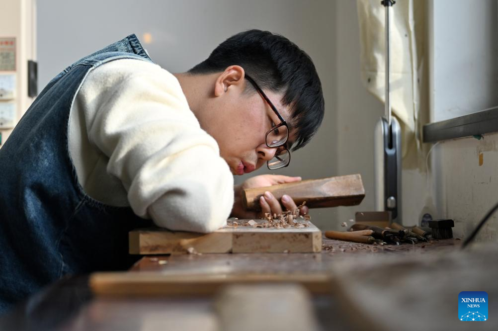 Xi Wang works on a woodblock type at the Tianjin Yangliuqing picture studio in Tianjin, north China, Dec. 26, 2023. (Xinhua/Zhao Zishuo)