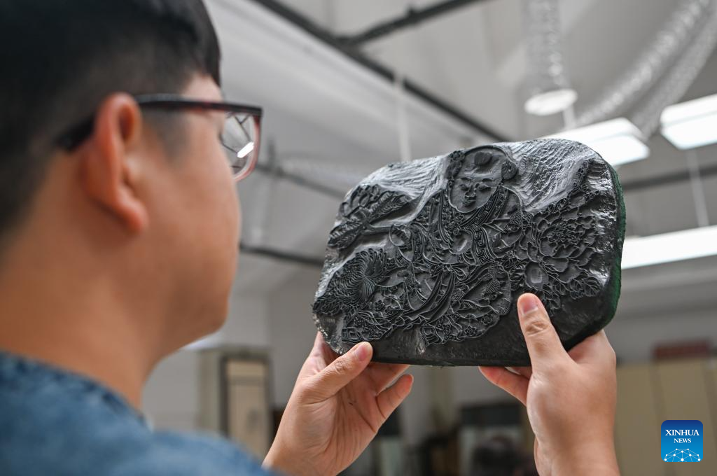 Xi Wang works on a woodblock type at the Tianjin Yangliuqing picture studio in Tianjin, north China, Dec. 26, 2023. (Xinhua/Li Ran)