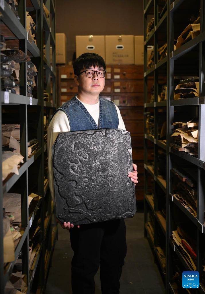 Xi Wang searches for an ancient woodblock type at the Tianjin Yangliuqing picture studio in Tianjin, north China, Dec. 26, 2023. (Xinhua/Zhao Zishuo)