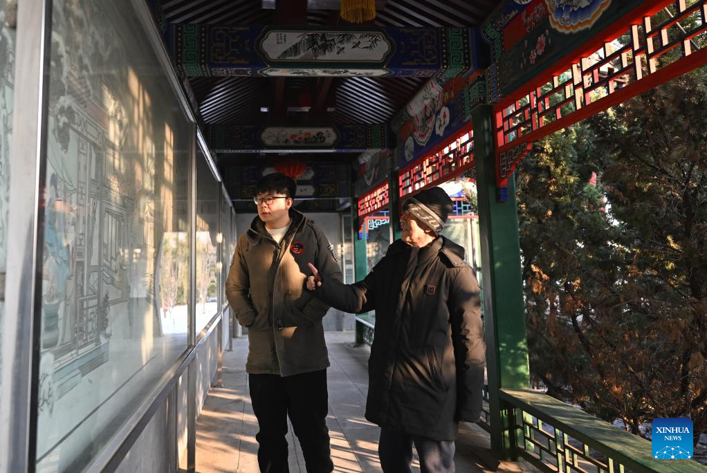 Xi Wang (L) and his mentor Wang Wenda visit a new year picture-themed park in Tianjin, north China, Dec. 27, 2023. (Xinhua/Li Ran)