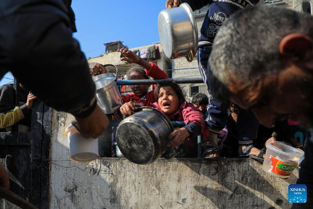 Children try to get food relief in the southern Gaza Strip city of Rafah, on Dec. 31, 2023. (Photo by Rizek Abdeljawad/Xinhua)