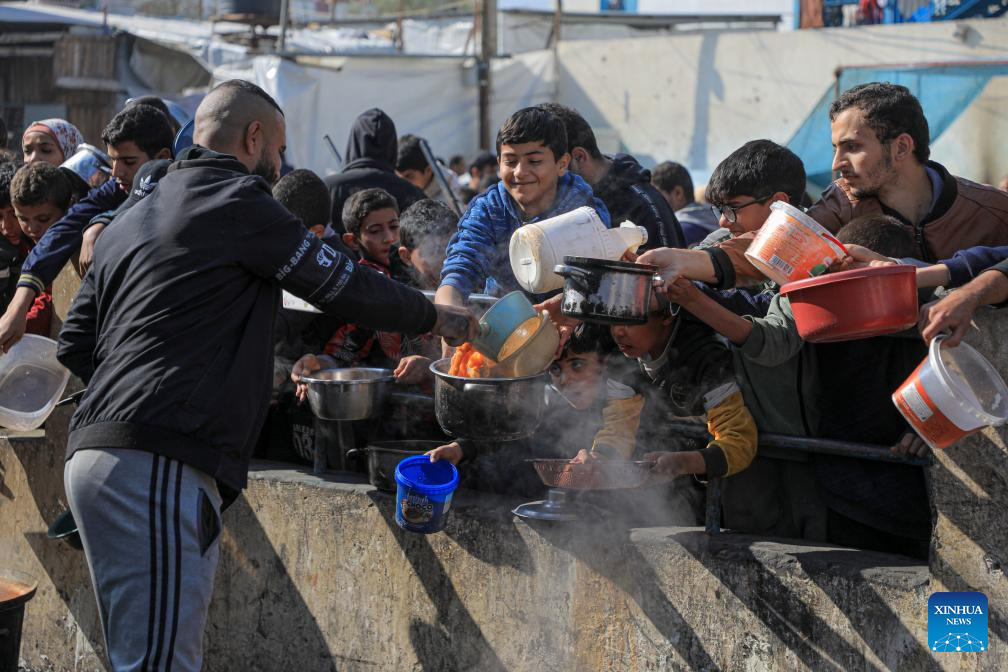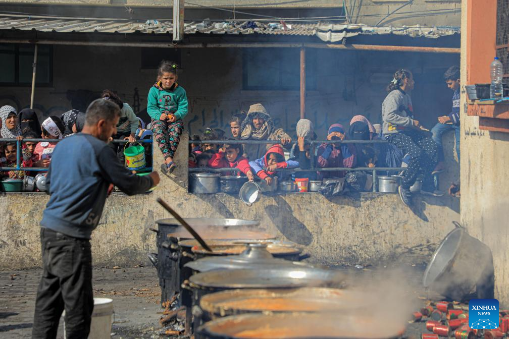 Children wait for food relief in the southern Gaza Strip city of Rafah, on Dec. 31, 2023. (Photo by Rizek Abdeljawad/Xinhua)