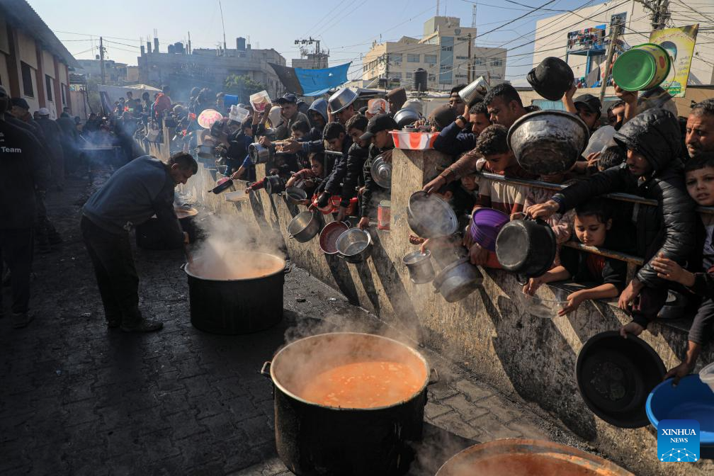 People wait for food relief in the southern Gaza Strip city of Rafah, on Dec. 31, 2023. (Photo by Rizek Abdeljawad/Xinhua)