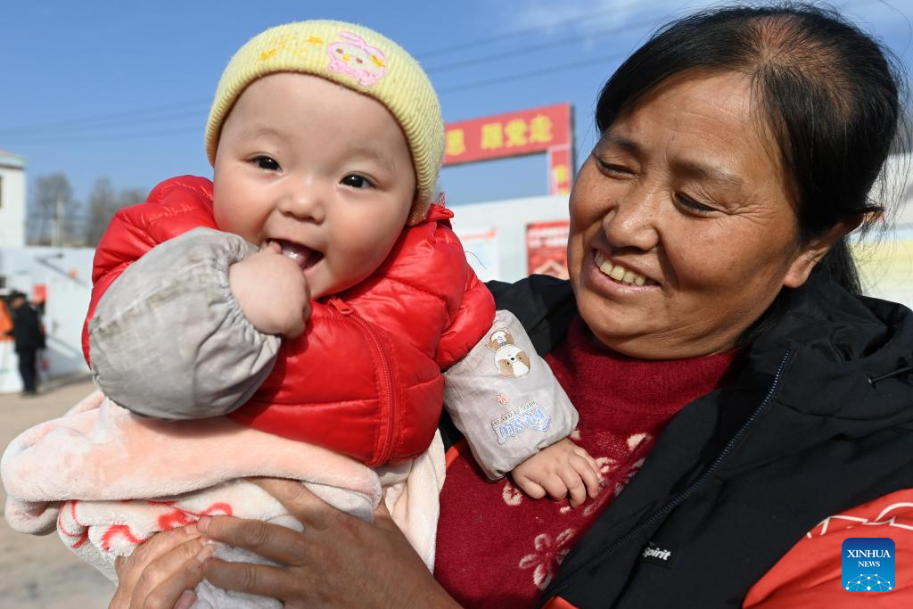 A villager holds a baby at a temporary relocation site in Tuanjie Village of Liuji Township, Jishishan County, northwest China's Gansu Province, Jan. 1, 2024. All forces continued to stick to their posts at the temporary relocation sites for quake-affected people in northwest China's Gansu Province and the neighboring Qinghai Province on the first day of 2024. (Xinhua/Fan Peishen)