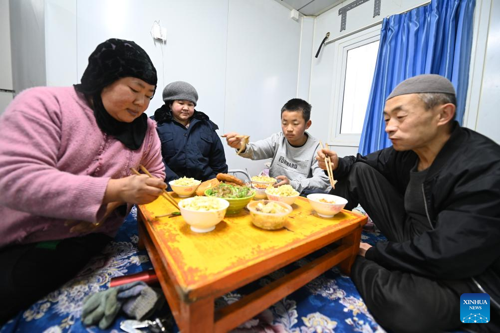 Villagers have a meal in a prefabricated house at a temporary relocation site in Dahe Village of Dahejia Township, Jishishan County, northwest China's Gansu Province, Jan. 1, 2024. All forces continued to stick to their posts at the temporary relocation sites for quake-affected people in northwest China's Gansu Province and the neighboring Qinghai Province on the first day of 2024. (Xinhua/Fan Peishen)