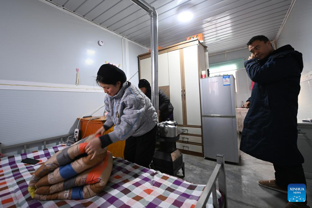 A villager tidies her room in a prefabricated house at a temporary relocation site in Dahe Village of Dahejia Township, Jishishan County, northwest China's Gansu Province, Jan. 1, 2024. All forces continued to stick to their posts at the temporary relocation sites for quake-affected people in northwest China's Gansu Province and the neighboring Qinghai Province on the first day of 2024. (Xinhua/Fan Peishen)