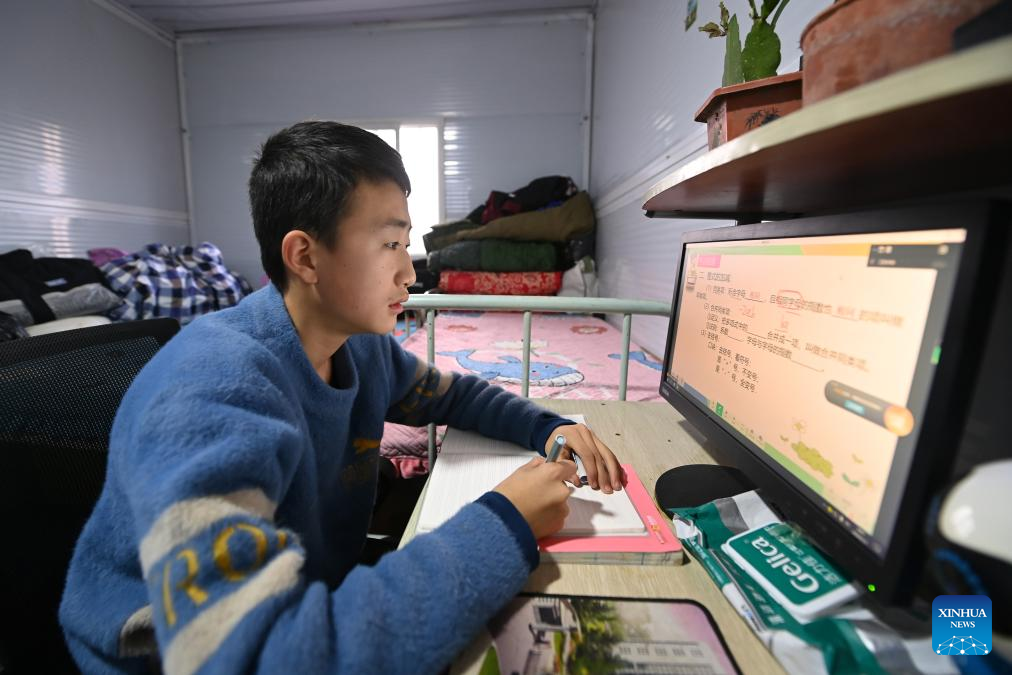 A student takes online classes in a prefabricated house at a temporary relocation site in Shenjiaping Village of Shiyuan Township, Jishishan County, northwest China's Gansu Province, Jan. 1, 2024. All forces continued to stick to their posts at the temporary relocation sites for quake-affected people in northwest China's Gansu Province and the neighboring Qinghai Province on the first day of 2024. (Xinhua/Fan Peishen)
