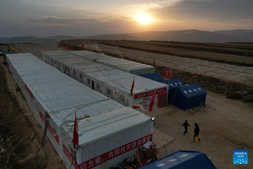 This aerial photo taken on Jan. 1, 2024 shows a temporary relocation site at sunrise in Shenjiaping Village of Shiyuan Township, Jishishan County, northwest China's Gansu Province. All forces continued to stick to their posts at the temporary relocation sites for quake-affected people in northwest China's Gansu Province and the neighboring Qinghai Province on the first day of 2024. (Xinhua/Fan Peishen)
