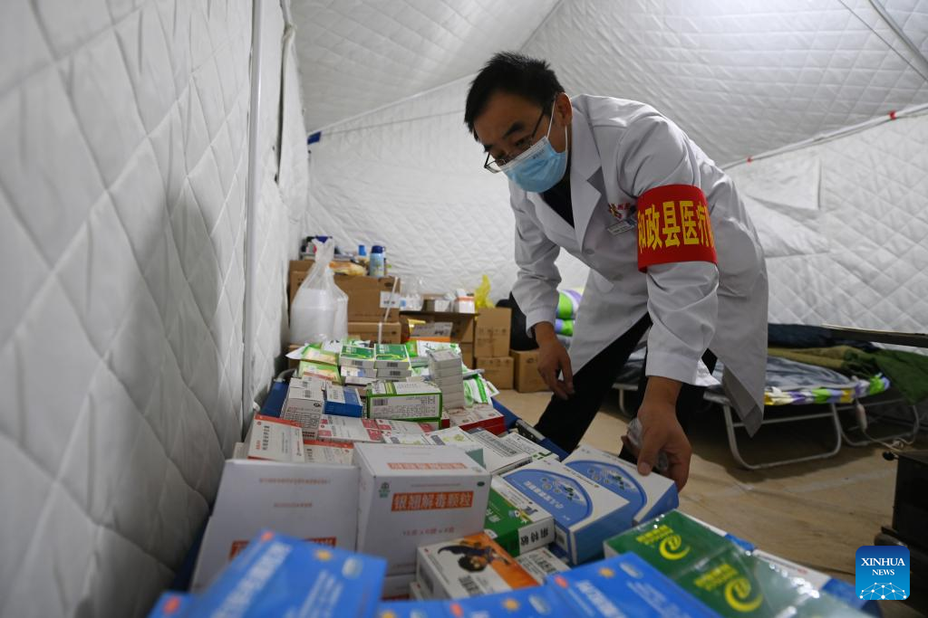 Wang Ming, a member of a medical team, sorts medicines at a temporary relocation site in Shenjiaping Village of Shiyuan Township, Jishishan County, northwest China's Gansu Province, Jan. 1, 2024. All forces continued to stick to their posts at the temporary relocation sites for quake-affected people in northwest China's Gansu Province and the neighboring Qinghai Province on the first day of 2024. (Xinhua/Fan Peishen)