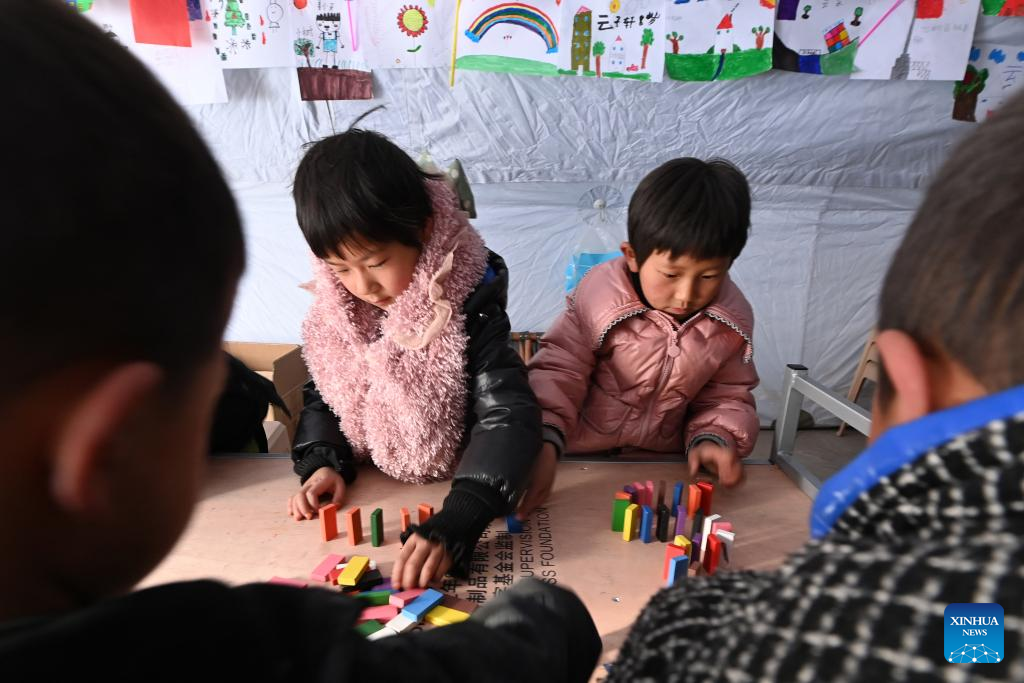 Children play in a prefabricated house at a temporary relocation site in Kexinmin Village of Dahejia Township, Jishishan County, northwest China's Gansu Province, Jan. 1, 2024. All forces continued to stick to their posts at the temporary relocation sites for quake-affected people in northwest China's Gansu Province and the neighboring Qinghai Province on the first day of 2024. (Xinhua/Fan Peishen)