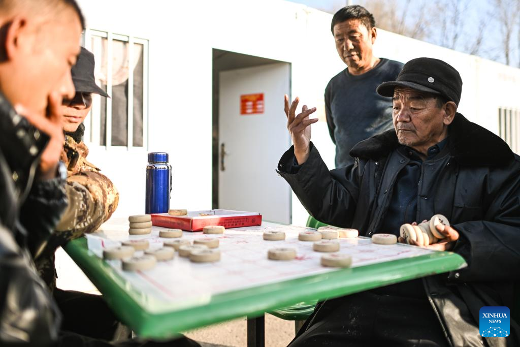 Villagers play Chinese chess at a temporary relocation site in Lajia Village of Minhe Hui and Tu Autonomous County, Haidong City, northwest China's Qinghai Province, Jan. 1, 2024. All forces continued to stick to their posts at the temporary relocation sites for quake-affected people in northwest China's Gansu Province and the neighboring Qinghai Province on the first day of 2024. (Xinhua/Zhang Long)