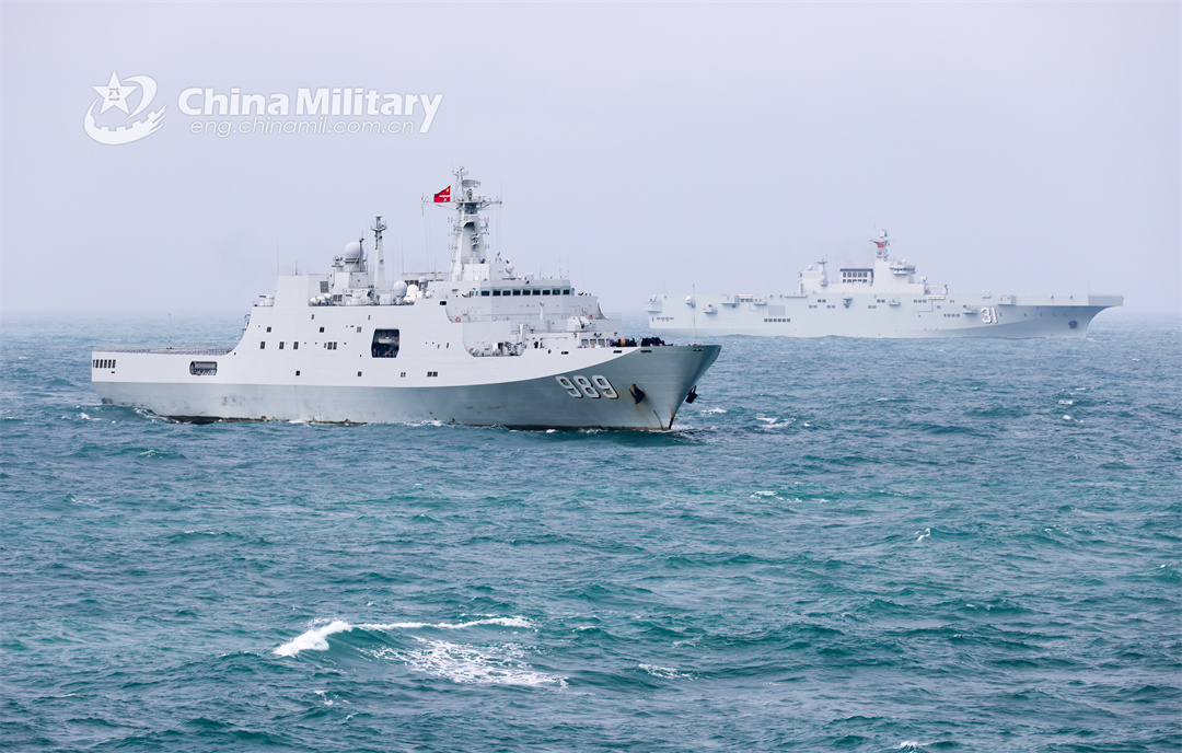 The amphibious dock landing ship Changbaishan and the amphibious assault ship Hainan attached to a landing ship flotilla of the navy under the PLA Southern Theater Command steam in formation during a maritime training exercise in recent days. (eng.chinamil.com.cn/Photo by Xu Miaobo)