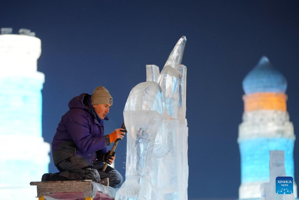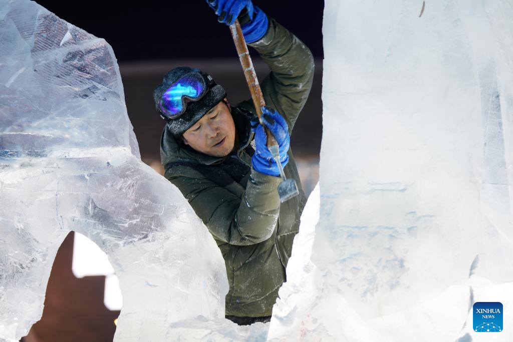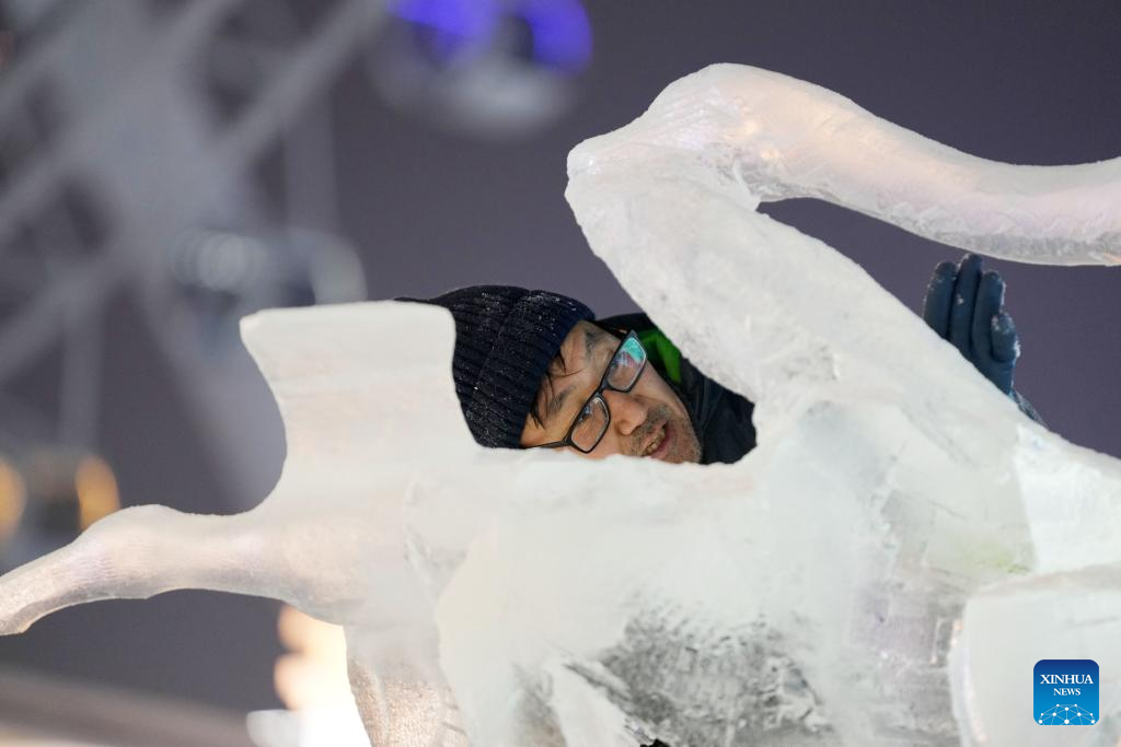 A competitor works on an ice sculpture during the 35th Harbin International Ice Sculpture Competition at Harbin Ice-Snow World in Harbin, northeast China's Heilongjiang Province, Jan. 2, 2024. The three-day competition kicked off here on Tuesday. (Xinhua/Wang Jianwei)