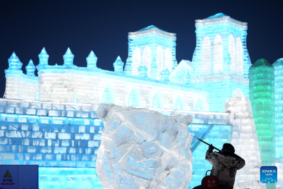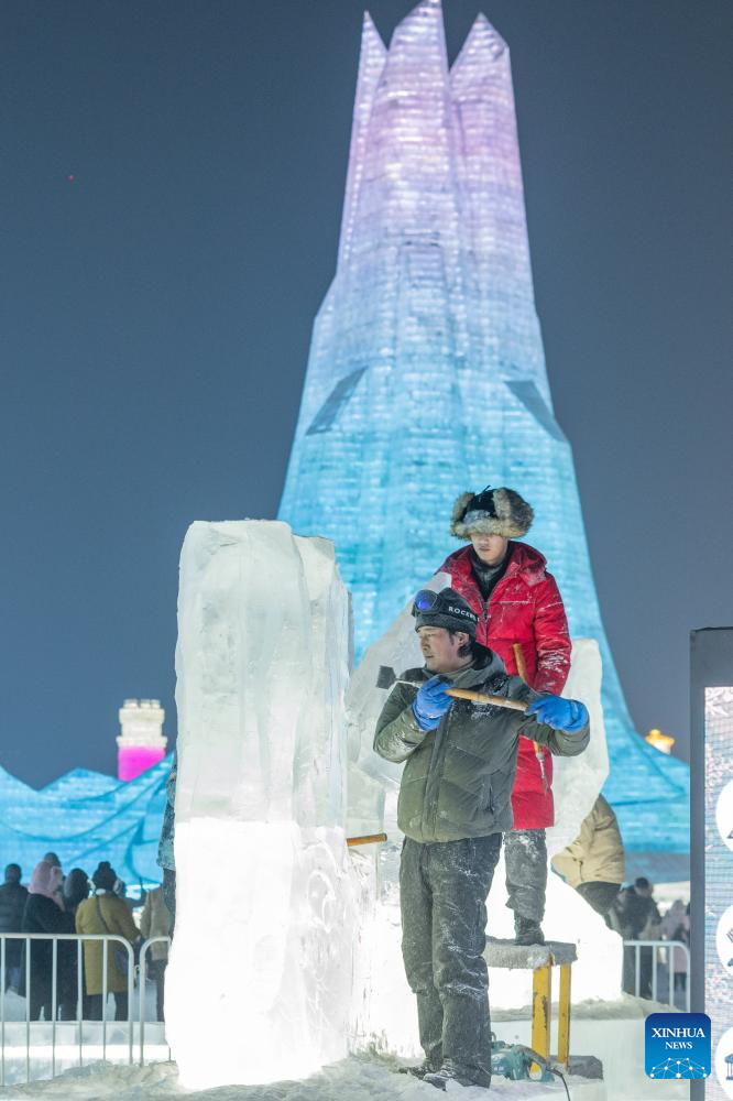 Competitors work on ice sculptures during the 35th Harbin International Ice Sculpture Competition at Harbin Ice-Snow World in Harbin, northeast China's Heilongjiang Province, Jan. 2, 2024. The three-day competition kicked off here on Tuesday. (Xinhua/Wang Jianwei)
