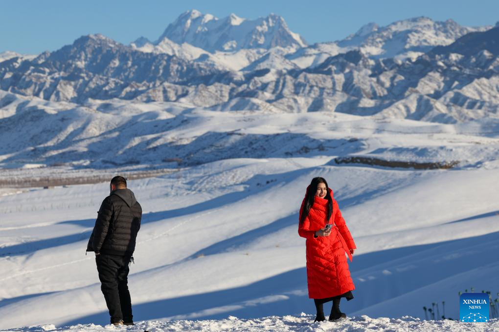 Tourists have fun at a sightseeing platform near Tianshan Village of Tiechanggou Town in Urumqi, northwest China's Xinjiang Uygur Autonomous Region, Jan. 1, 2024. (Xinhua/Hu Huhu)