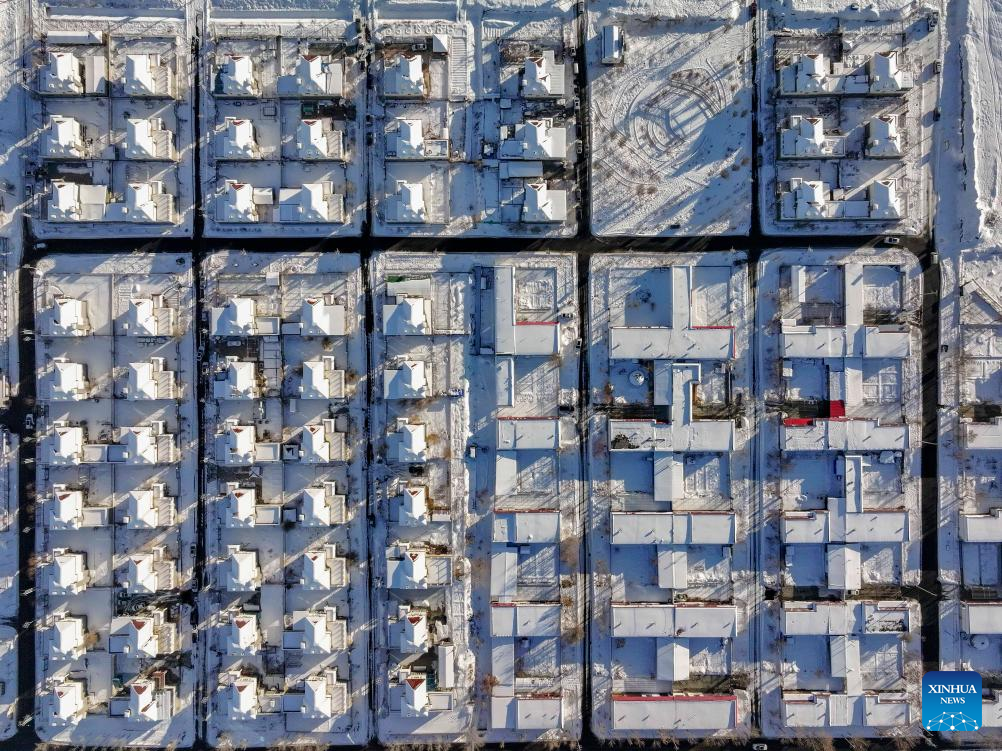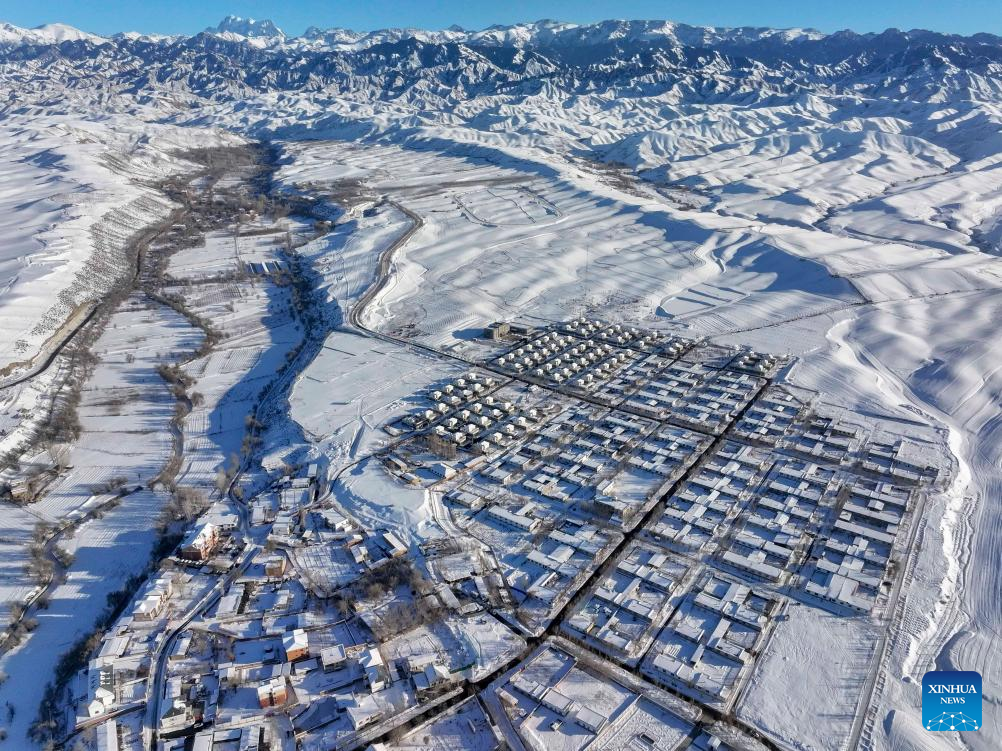 This aerial photo taken on Jan. 1, 2024 shows a view of Tianshan Village of Tiechanggou Town in Urumqi, northwest China's Xinjiang Uygur Autonomous Region. (Xinhua/Hu Huhu)