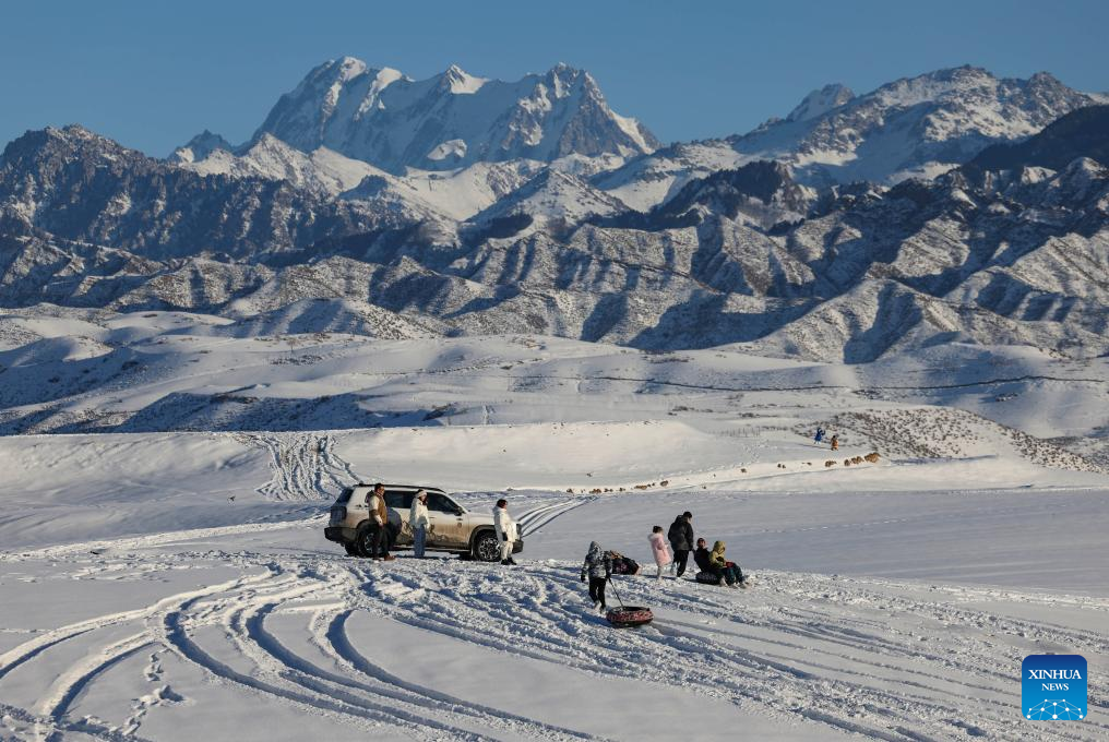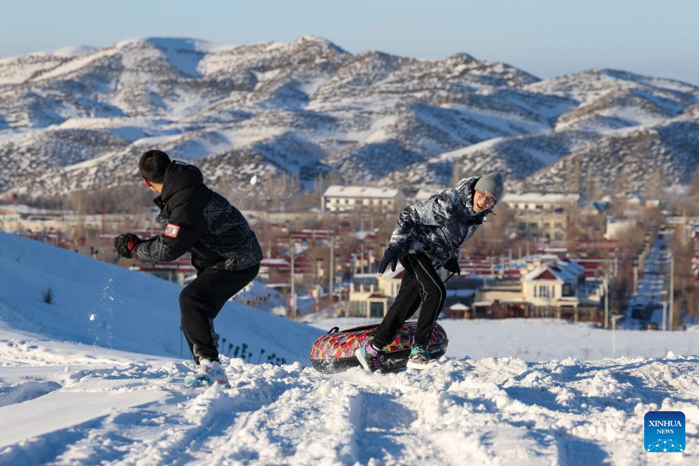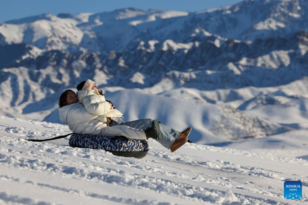 Tourists enjoy snow tubing near Tianshan Village of Tiechanggou Town in Urumqi, northwest China's Xinjiang Uygur Autonomous Region, Jan. 1, 2024. (Xinhua/Hu Huhu)