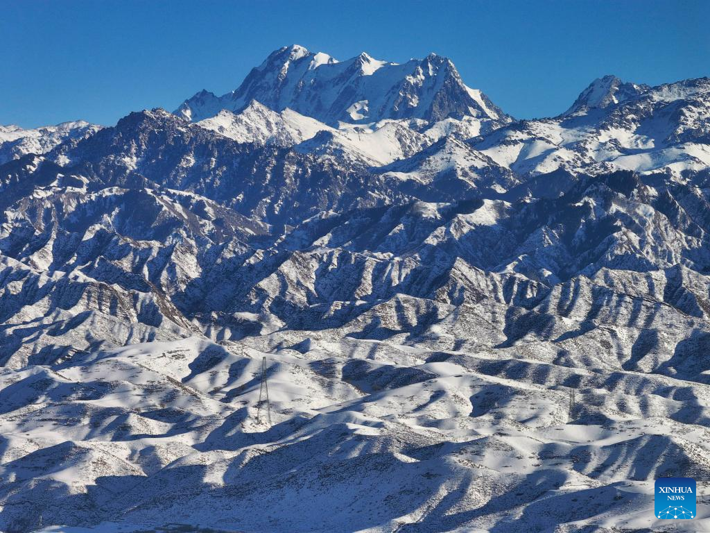 This aerial photo taken on Jan. 1, 2024 shows the Bogda Peak seen from Tianshan Village of Tiechanggou Town in Urumqi, northwest China's Xinjiang Uygur Autonomous Region. (Xinhua/Hu Huhu)