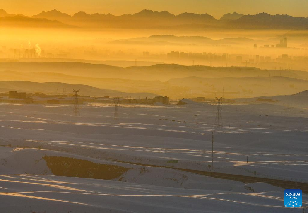 This aerial photo taken on Jan. 1, 2024 shows a view of downtown Urumqi seen from Tianshan Village of Tiechanggou Town in Urumqi, northwest China's Xinjiang Uygur Autonomous Region. (Xinhua/Hu Huhu)