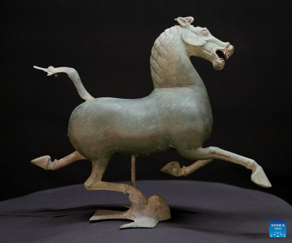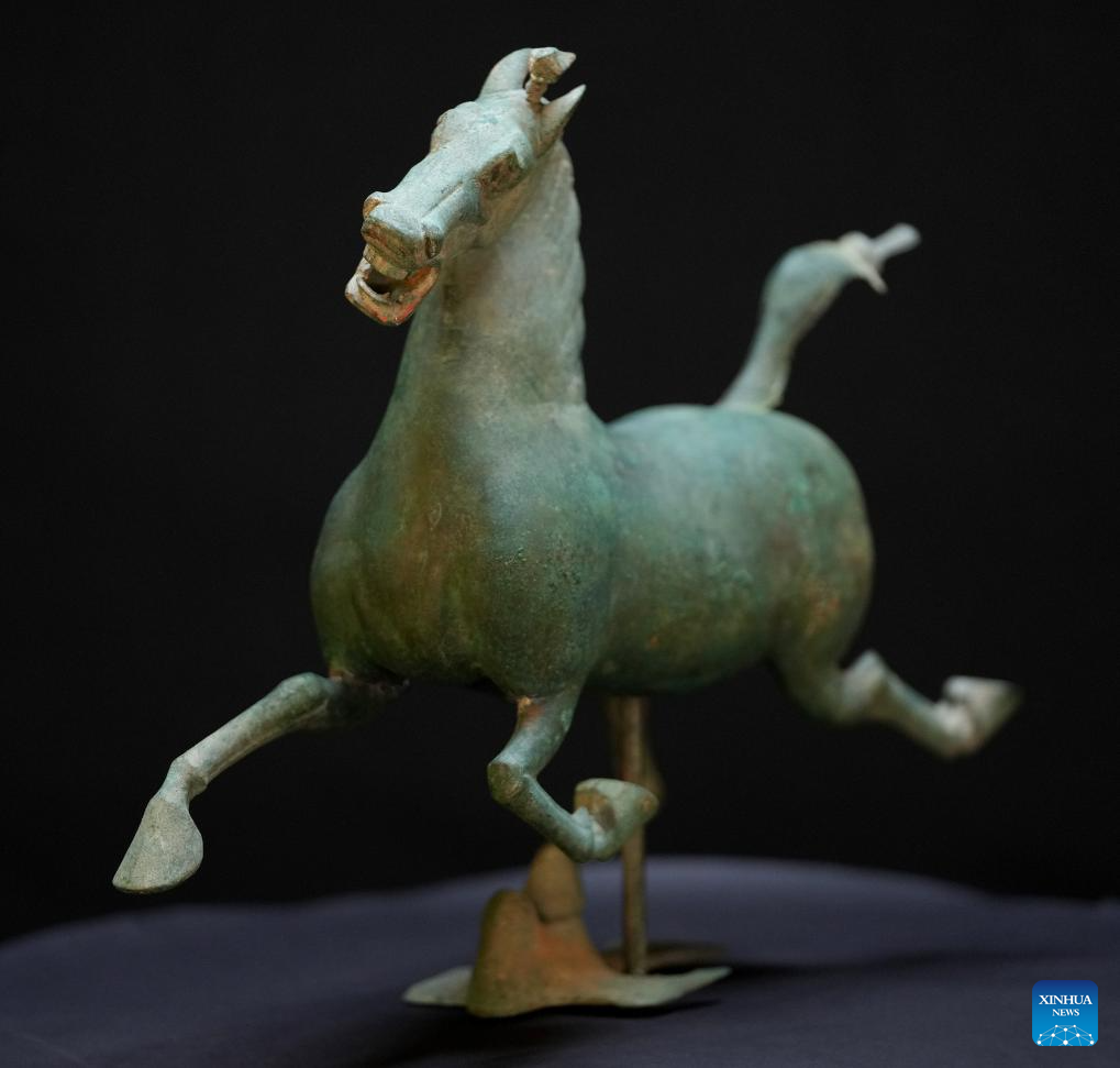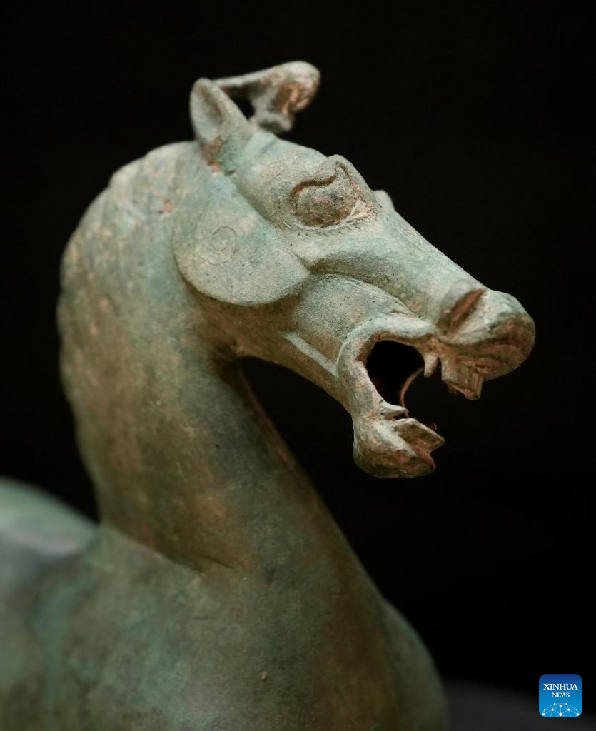 This photo taken on Oct. 27, 2023 shows the side view of an ancient bronze horse statue at Gansu Provincial Museum in Lanzhou, capital of northwest China's Gansu Province. The bronze horse statue, popularly known as "Bronze Galloping Horse Treading on a Flying Swallow," was unearthed in 1960s from the Leitai Tomb of the Eastern Han Dynasty (25-220 AD) in Wuwei of Gansu and is now preserved in the Gansu Provincial Museum. Its image became a symbol of Chinese tourism in 1983. (Xinhua/Wang Yuguo)