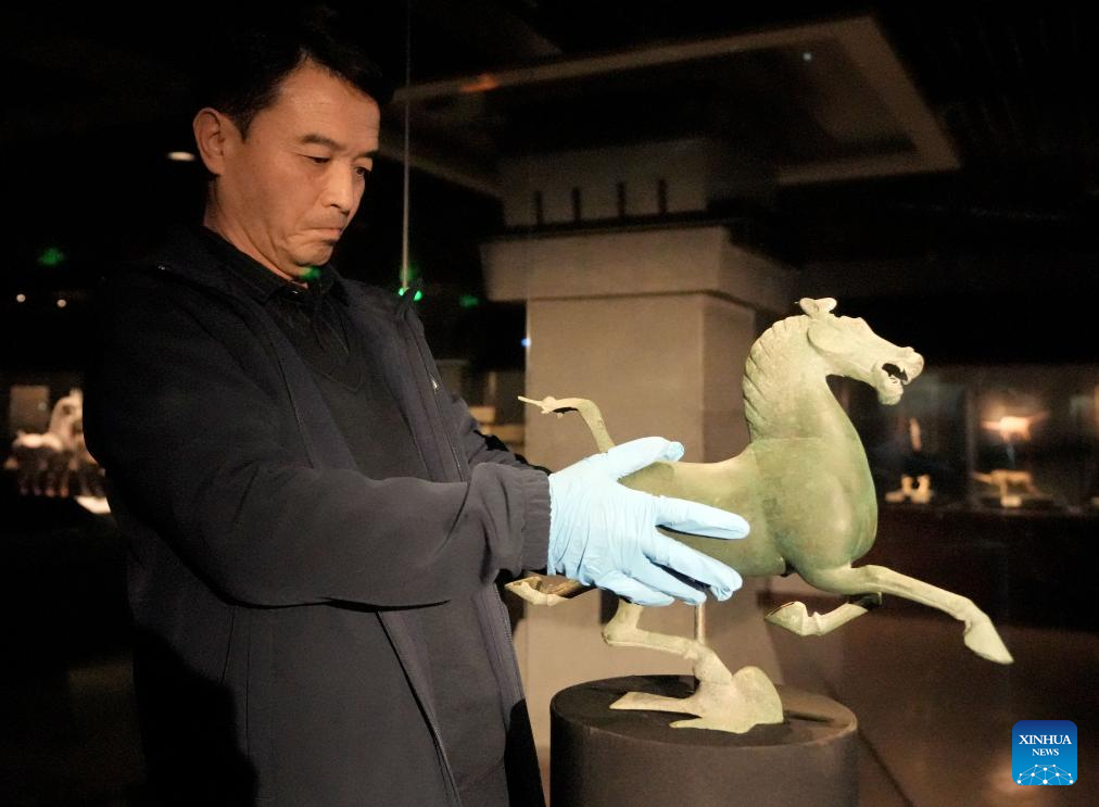 A staff member lays an ancient bronze horse statue at Gansu Provincial Museum in Lanzhou, capital of northwest China's Gansu Province, Oct. 27, 2023. The bronze horse statue, popularly known as "Bronze Galloping Horse Treading on a Flying Swallow," was unearthed in 1960s from the Leitai Tomb of the Eastern Han Dynasty (25-220 AD) in Wuwei of Gansu and is now preserved in the Gansu Provincial Museum. Its image became a symbol of Chinese tourism in 1983. (Xinhua/Wang Yuguo)