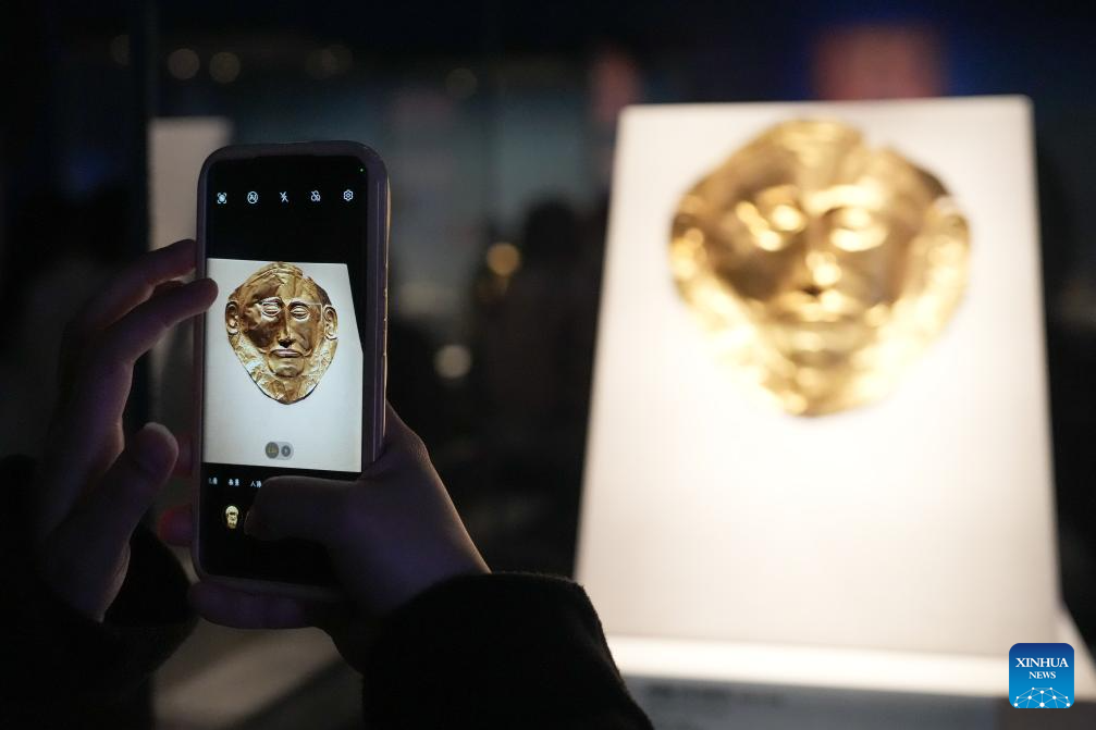 A visitor takes photos of a cultural relic at an exhibition titled "The Greeks: From Agamemnon to Alexander the Great" at Hunan Museum in Changsha, central China's Hunan Province, Jan. 3, 2024. The exhibition features a total of 270 pieces or sets of cultural relics from 14 museums and cultural institutions in Greece, including gold ware, bronze ware, pottery and sculptures. The exhibition is available until May 18, 2024. (Xinhua/Xue Yuge)
