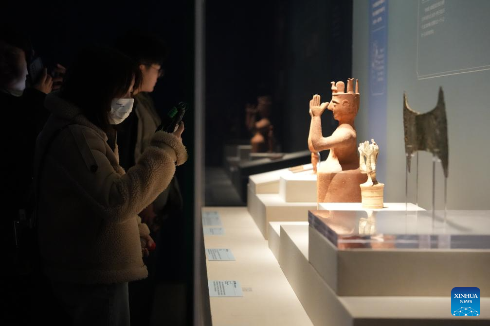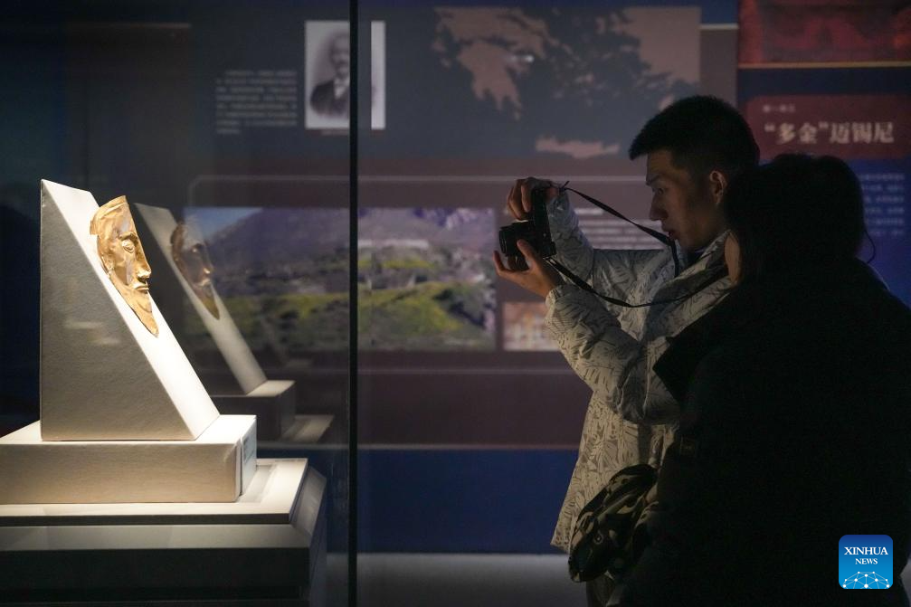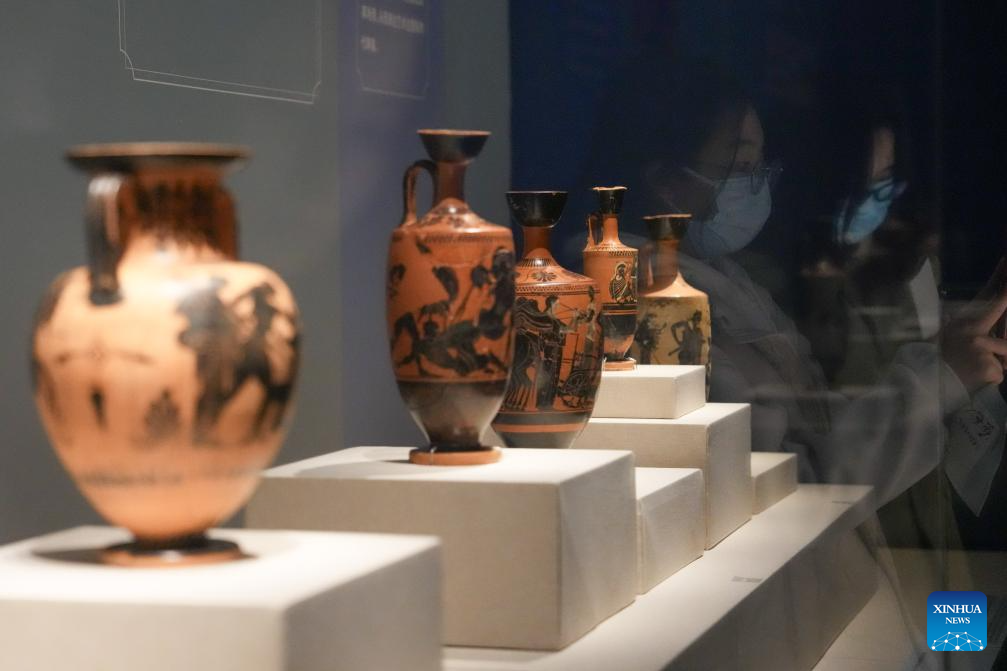 People visit an exhibition titled "The Greeks: From Agamemnon to Alexander the Great" at Hunan Museum in Changsha, central China's Hunan Province, Jan. 3, 2024. The exhibition features a total of 270 pieces or sets of cultural relics from 14 museums and cultural institutions in Greece, including gold ware, bronze ware, pottery and sculptures. The exhibition is available until May 18, 2024. (Xinhua/Xue Yuge)