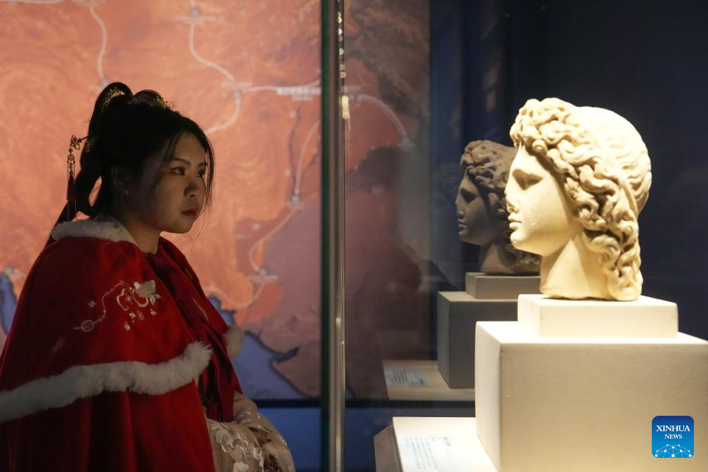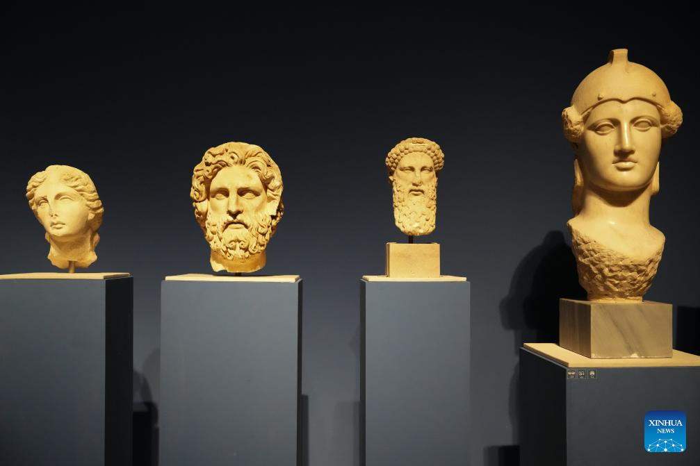 Sculptures are on display at an exhibition titled "The Greeks: From Agamemnon to Alexander the Great" at Hunan Museum in Changsha, central China's Hunan Province, Jan. 3, 2024. The exhibition features a total of 270 pieces or sets of cultural relics from 14 museums and cultural institutions in Greece, including gold ware, bronze ware, pottery and sculptures. The exhibition is available until May 18, 2024. (Xinhua/Xue Yuge)