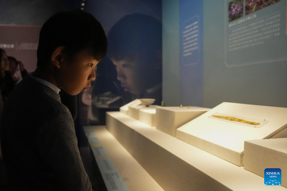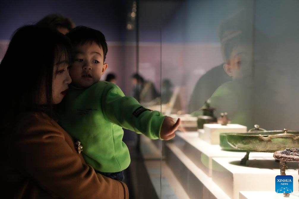 A boy visits an exhibition titled "The Greeks: From Agamemnon to Alexander the Great" at Hunan Museum in Changsha, central China's Hunan Province, Jan. 3, 2024. The exhibition features a total of 270 pieces or sets of cultural relics from 14 museums and cultural institutions in Greece, including gold ware, bronze ware, pottery and sculptures. The exhibition is available until May 18, 2024. (Xinhua/Xue Yuge)