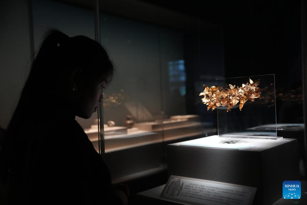 A visitor views a cultural relic at an exhibition titled "The Greeks: From Agamemnon to Alexander the Great" at Hunan Museum in Changsha, central China's Hunan Province, Jan. 3, 2024. The exhibition features a total of 270 pieces or sets of cultural relics from 14 museums and cultural institutions in Greece, including gold ware, bronze ware, pottery and sculptures. The exhibition is available until May 18, 2024. (Xinhua/Xue Yuge)