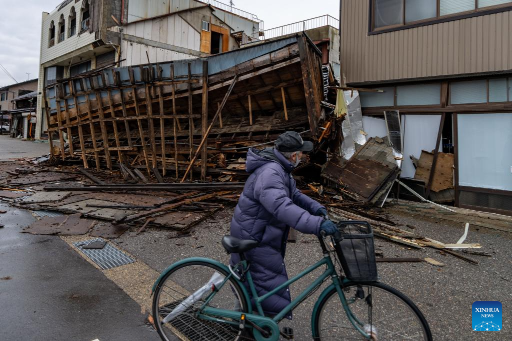 This photo taken on Jan. 3, 2024 shows earthquake-damaged houses in Nanao, Ishikawa prefecture. (Xinhua/Zhang Xiaoyu)