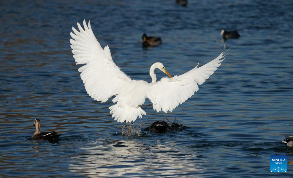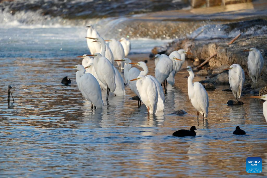 Egrets are pictured in Fenhe River in Taiyuan, north China's Shanxi Province, Jan. 3, 2024. (Xinhua/Zhan Yan)