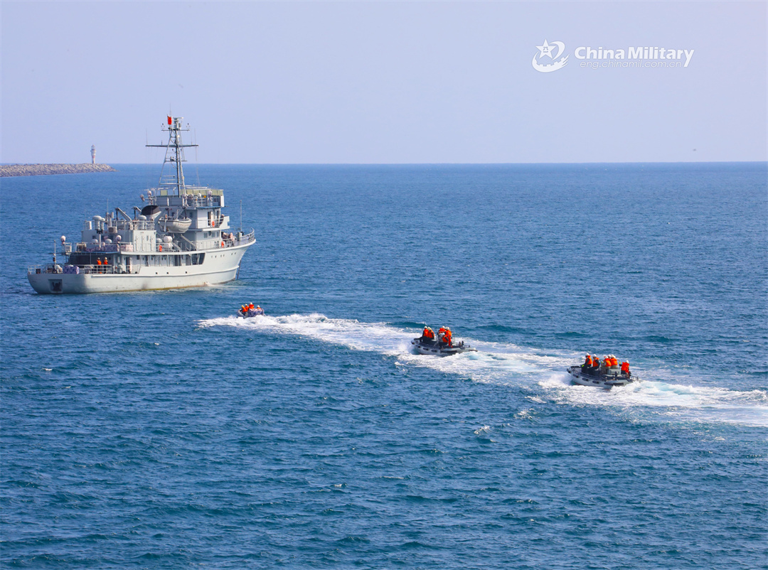 Speed boats attached to a naval service ship group of the PLA Navy approach a simulated war-damaged vessel to provide support during a four-day exercise in late December, 2023. (eng.chinamil.com.cn/Photo by Wu Huanqing)